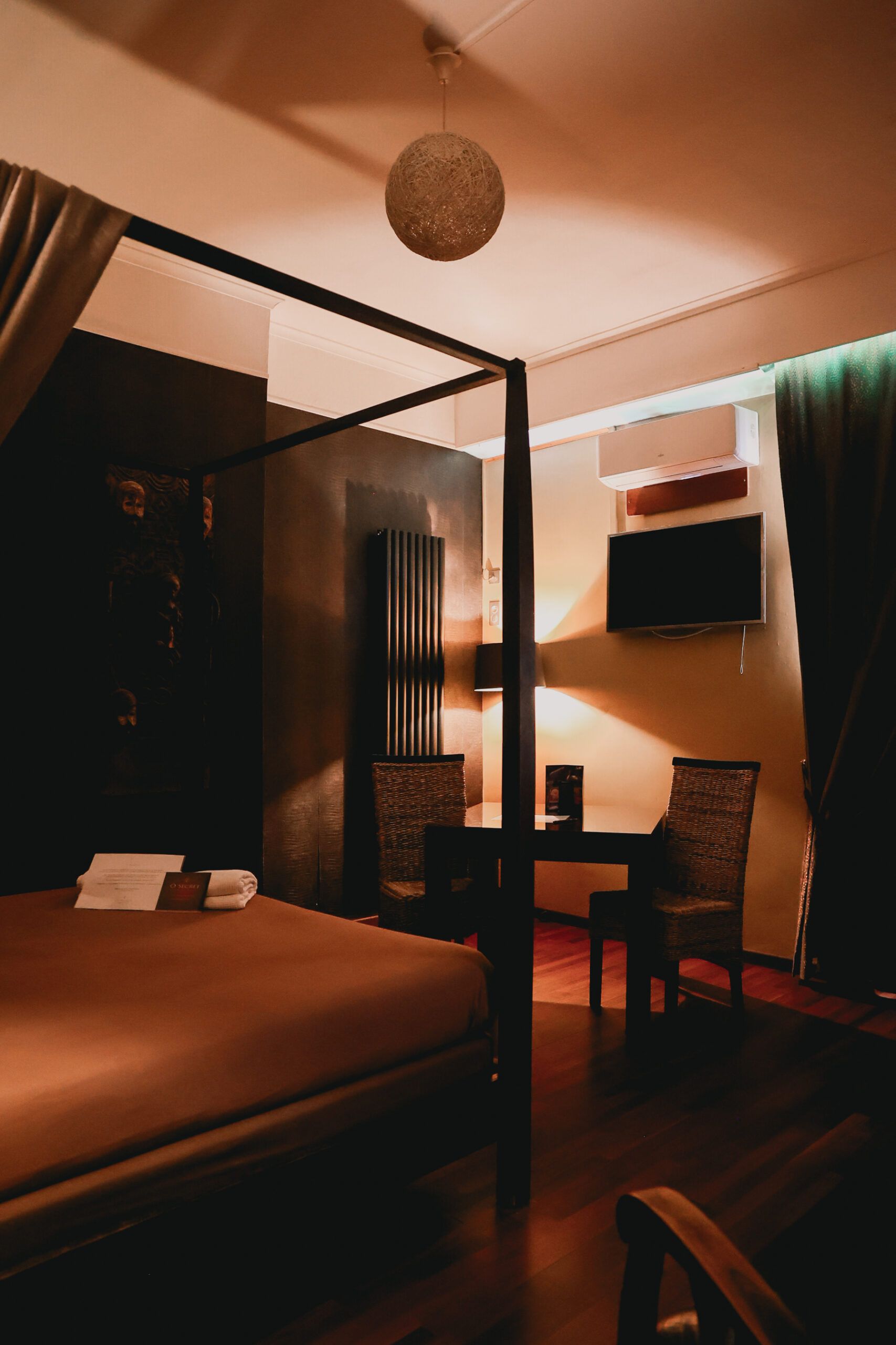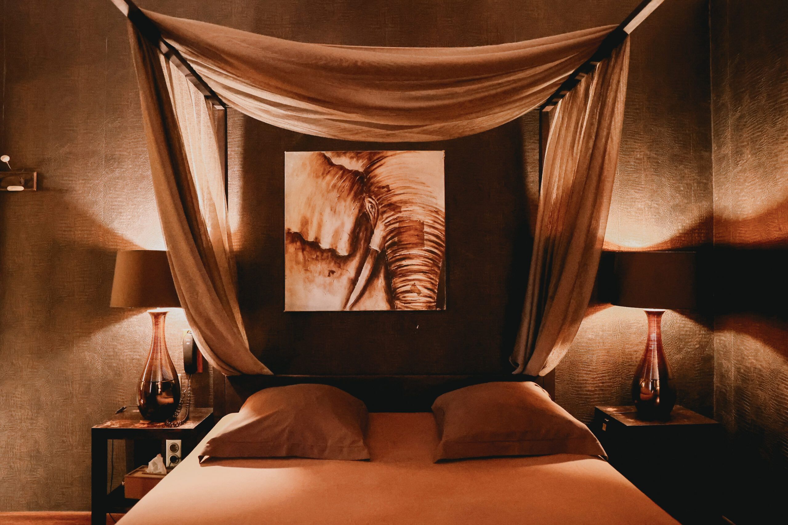 Cette chambre à thèmes vous transporte dans un univers exotique, grâce à ses couleurs riches et ses motifs inspirés de l’Afrique. Offrant un dépaysement complet, notre suite avec jacuzzi a été conçue pour vous offrir un confort ultime. Le lit king-size à baldaquin vous invite à vous blottir avec votre moitié, créant une atmosphère romantique. Vous pourrez aussi vous détendre dans un espace wellness privatif, aménagé pour votre confort et votre bien-être. Chaque détail de la suite African Queen a été soigneusement pensé pour vous offrir une expérience exceptionnelle.