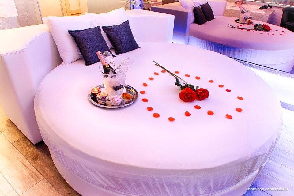 Découvrez notre chambre avec jacuzzi privatif et son lit rond XXL vous invitant à vous prélasser dans un confort total, digne de la royauté. Le gigantesque miroir situé en face apporte une dimension particulière à la pièce. Véritable espace de détente, la salle de bain dispose quant à elle d’une baignoire balnéo et une douche italienne. Pour compléter l’expérience, la suite Marie-Antoinette offre un coin repas, idéal pour un diner aux chandelles.